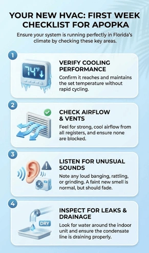 Just installed a new HVAC system in your Apopka home? From firsthand experience, we’ve found that the first week is when small installation issues—like uneven airflow, incorrect thermostat calibration, or poor humidity control—tend to show up. Catching them early can make the difference between a system that simply runs and one that delivers reliable comfort, lower energy bills, and long-term performance. This guide breaks down the exact checks we recommend during those first few days, based on what actually matters in Apopka’s hot, humid climate—so you can be confident your system was installed right and built to last.